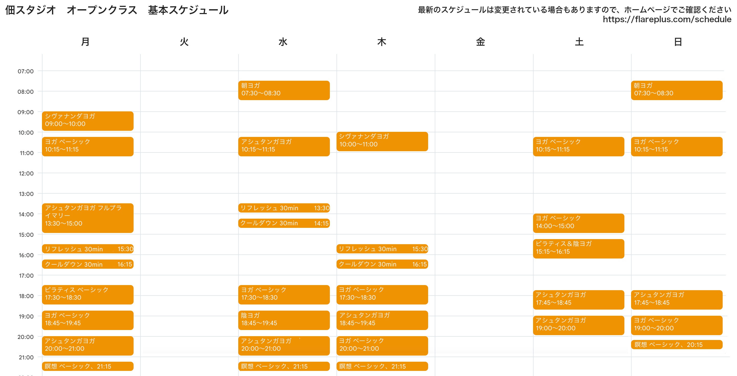 オープンクラス:朝ヨガ/ヨガベーシック/アシュタンガヨガ/アシュタンガヨガ フルプライマリー/シヴァナンダヨガ/陰ヨガ/ピラティスベーシック/ピラティス&陰ヨガ/リフレッシュ/クールダウン/瞑想ベーシック
