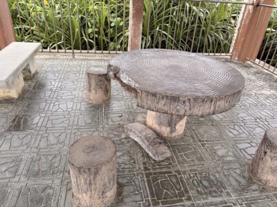 人は結構多いのであまり瞑想に適していない場所かもしれませんが、池を見渡せるベンチや東屋もあるので、座って落ち着くことはできます。机は崩壊してます↓。