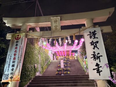 こちらはこの時間でも明るい!むしろ明るすぎる!いつものピンク色です。参拝客も少しいました。