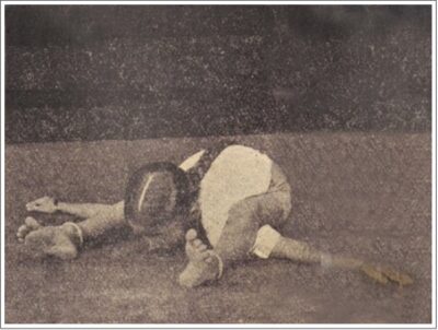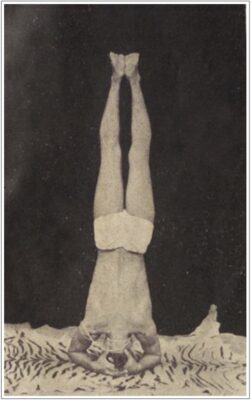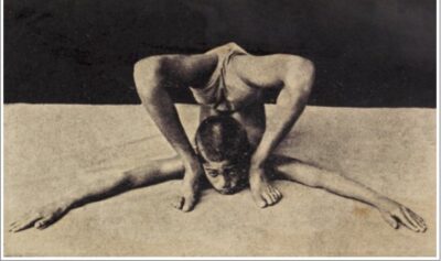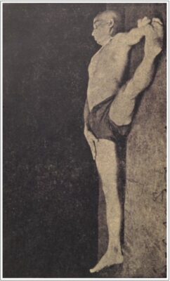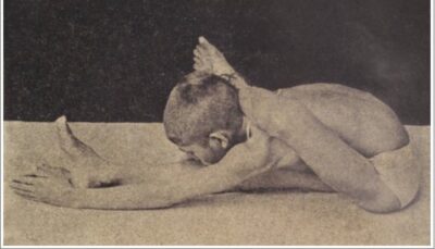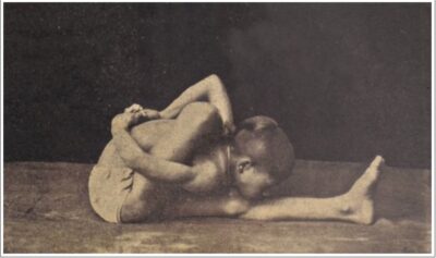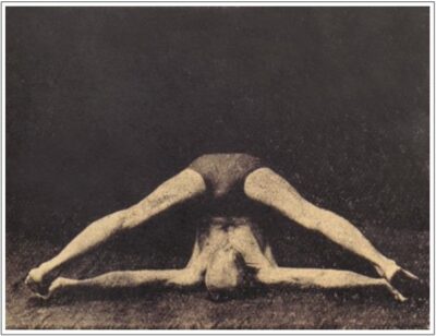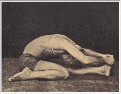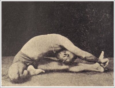 定番の坐位の開脚前屈ポーズです。写真では、現代よく行われている形とは少し異なり、おでこを床につく形になっているようですが、説明のほうでは顔を床につけるべしと書いてあるので、あまり細かい違いはないかもしれません。