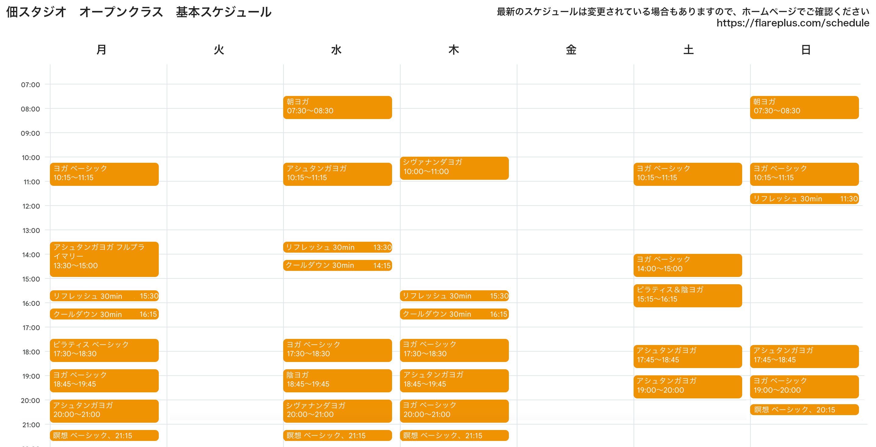 オープンクラス:朝ヨガ/ヨガベーシック/アシュタンガヨガ/アシュタンガヨガ フルプライマリー/シヴァナンダヨガ/陰ヨガ/ピラティスベーシック/ピラティス&陰ヨガ/リフレッシュ/クールダウン/瞑想ベーシック