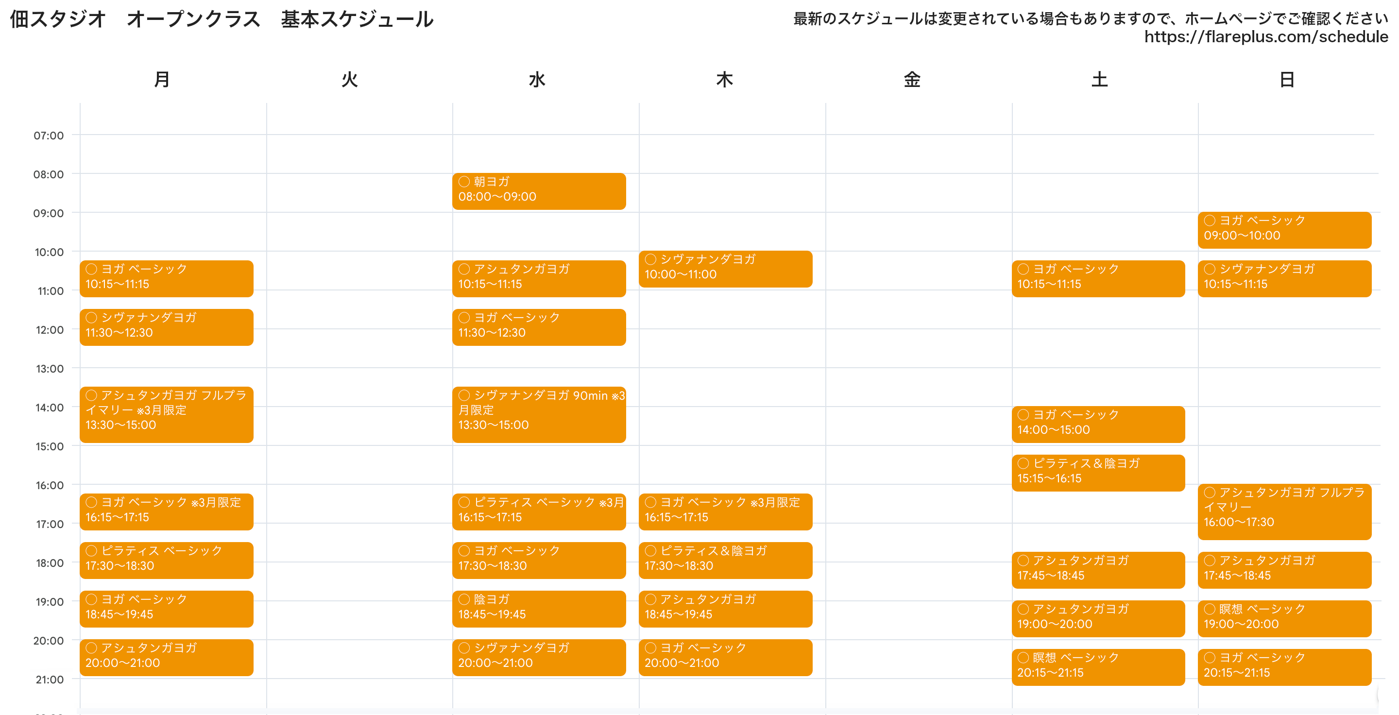 オープンクラス:朝ヨガ/ヨガベーシック/アシュタンガヨガ/アシュタンガヨガ フルプライマリー/シヴァナンダヨガ/陰ヨガ/ピラティスベーシック/ピラティス&陰ヨガ/リフレッシュ/リラックス/瞑想ベーシック