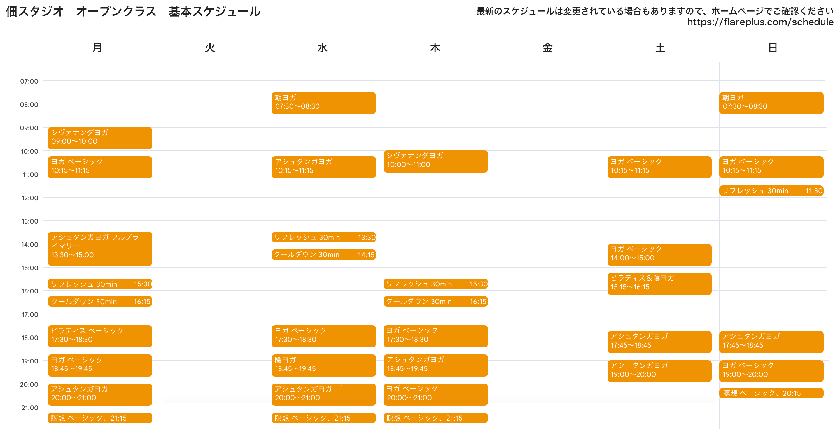 オープンクラス:朝ヨガ/ヨガベーシック/アシュタンガヨガ/アシュタンガヨガ フルプライマリー/シヴァナンダヨガ/陰ヨガ/ピラティスベーシック/ピラティス&陰ヨガ/リフレッシュ/クールダウン/瞑想ベーシック